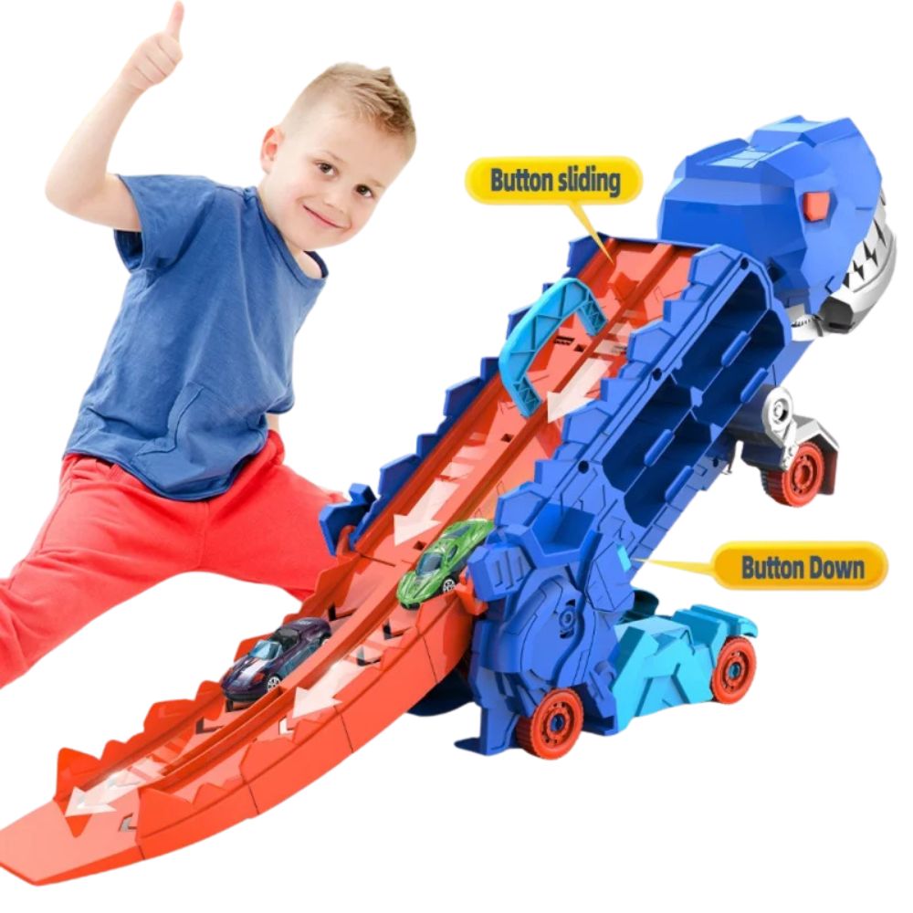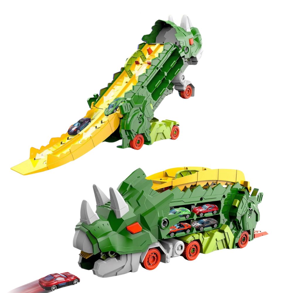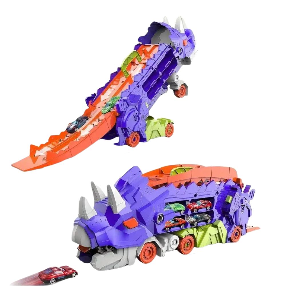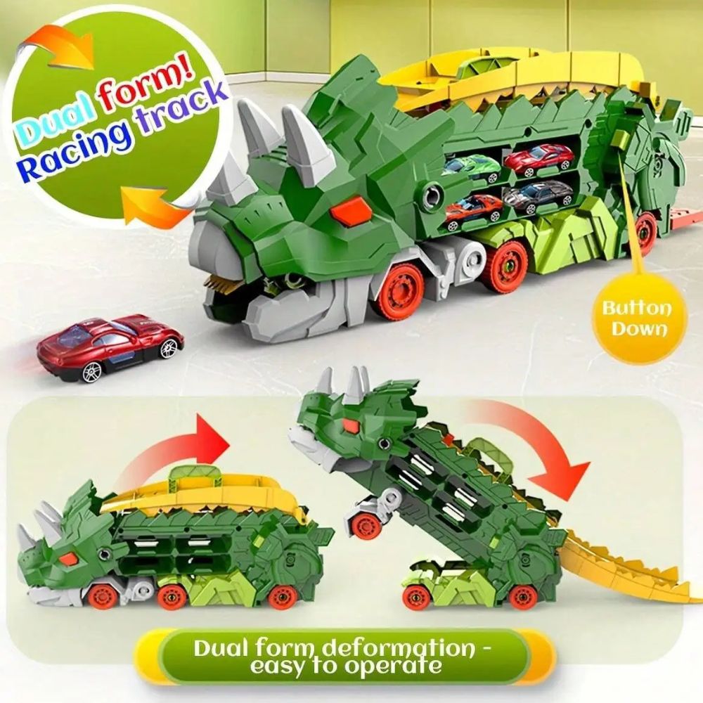 Experience the ultimate play experience with the Dinosaur Transporter Push-along Race Track Set that seamlessly transforms from a cool transport truck to a standing dino. Perfect for kids who love adventure, racing and dinosaurs !