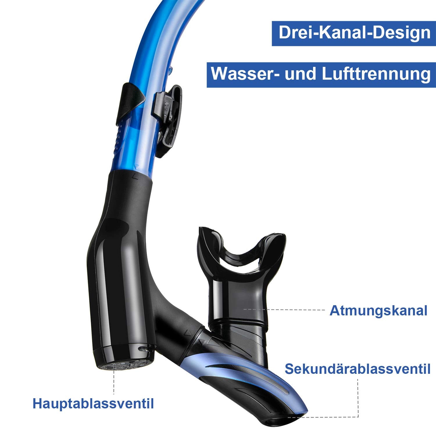 Dry snorkel with 3-channel system: main/auxiliary valves & air channel - effectively protects against water