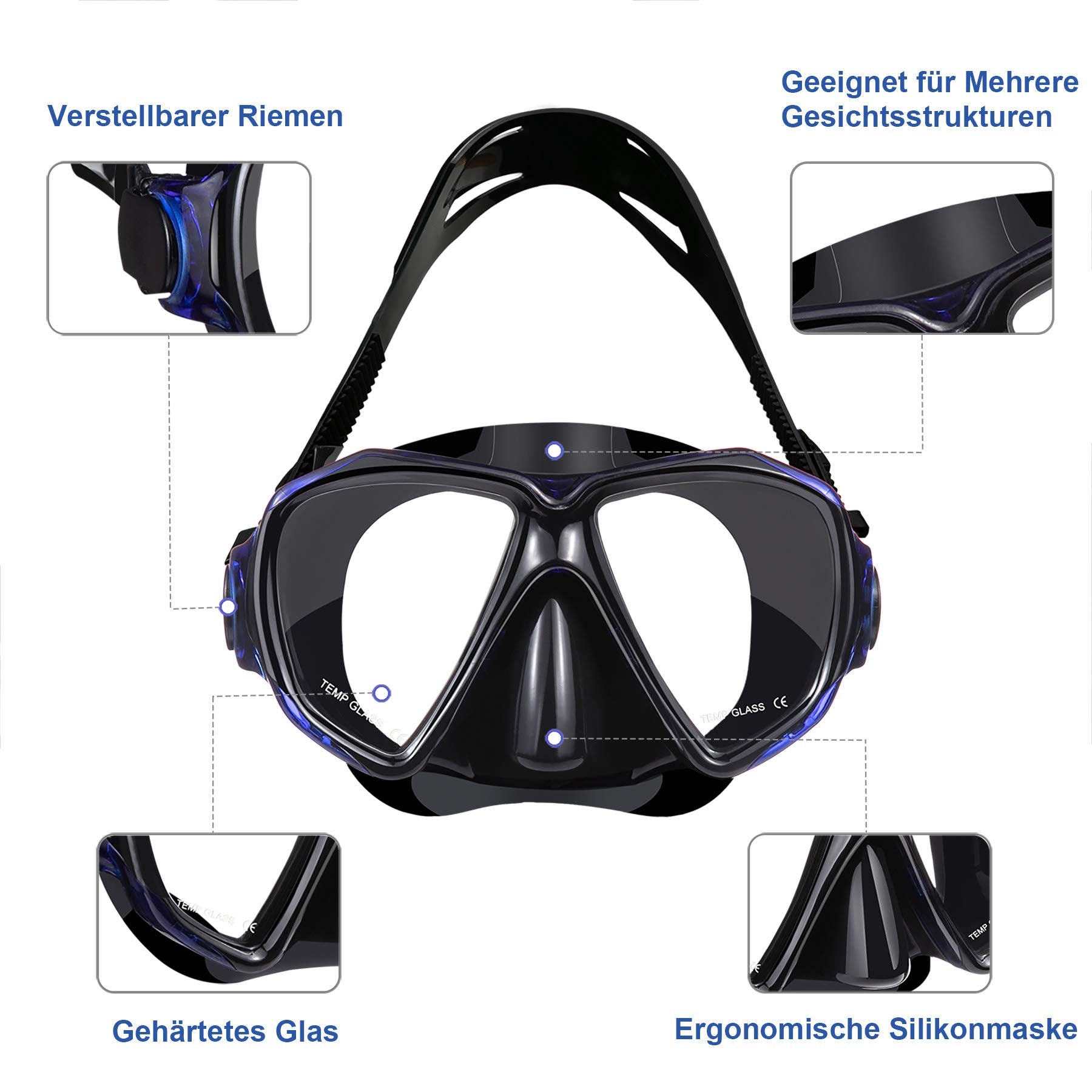 Set with snorkel and diving mask: Anti-fog 3-channel diving mask made of tempered glass