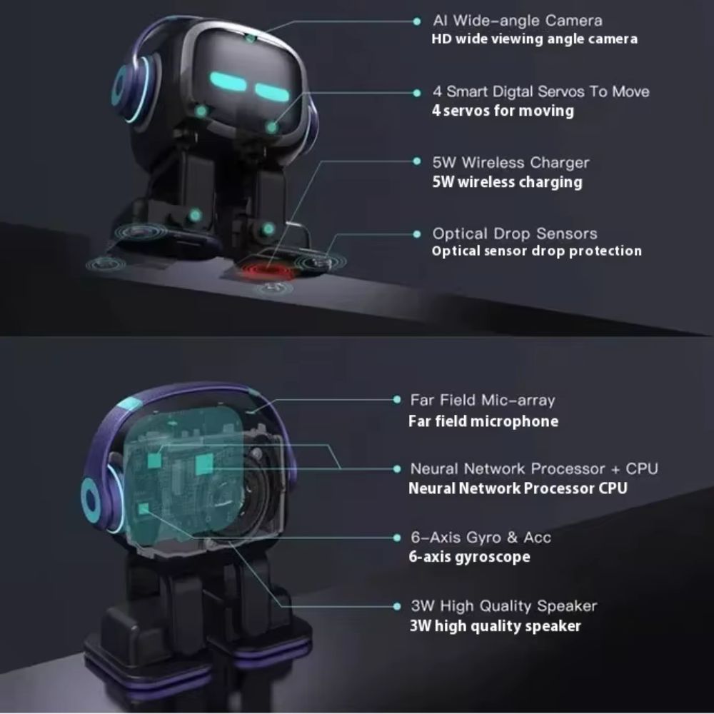 Built-in safety: With optical sensors and a 6-axis gyroscope, EMO stays safely on the table and won't fall off.