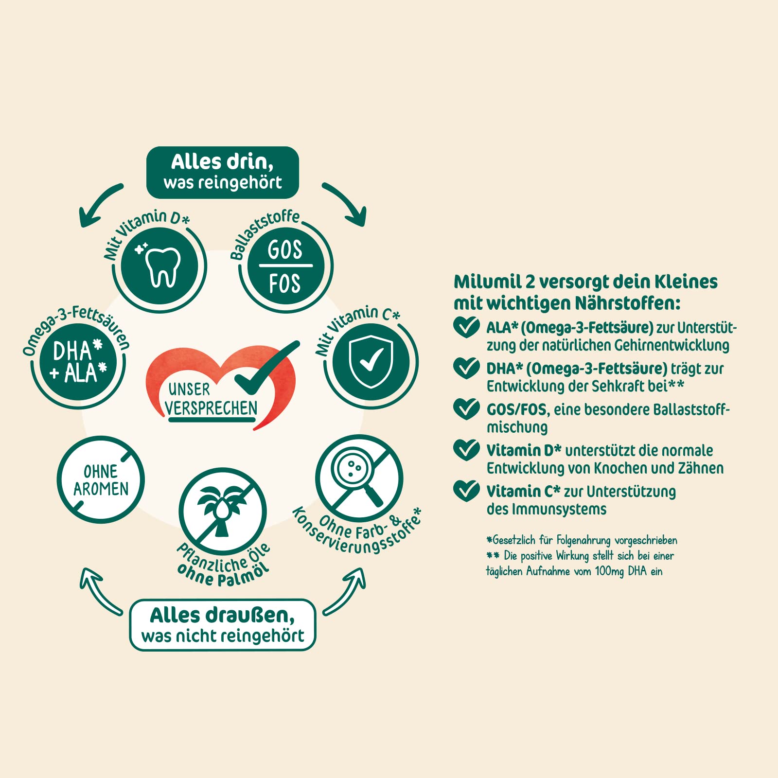 Milupa Milumil 2 is an ideal follow-on milk for babies from 6 months and is a perfect match for complementary foods.