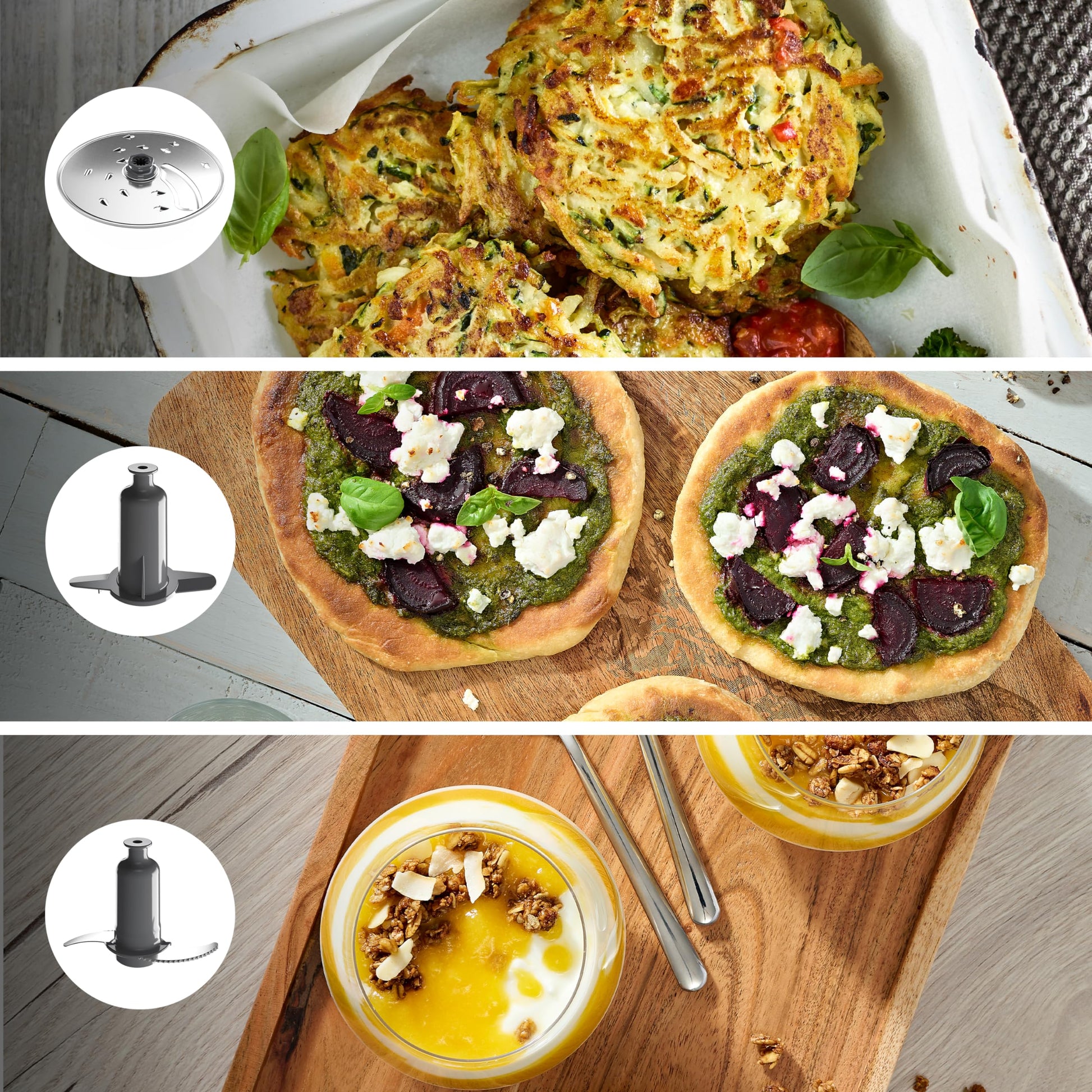 Dank Express Serve schneidest und raspelst du direkt auf den Teller - für weniger Abwasch. Die Eversharp Klingen sorgen für langanhaltende Schärfe und präzise Ergebnisse selbst bei harten Zutaten.