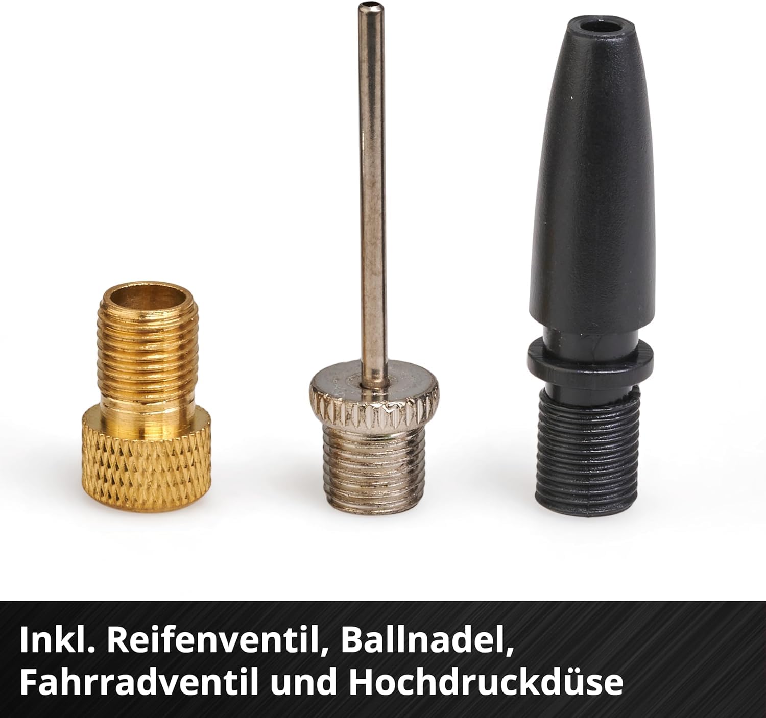 Inkl. Ballnadel, Fahrradventil und Hochdruckdüse, alles direkt am Gerät verstaubar.